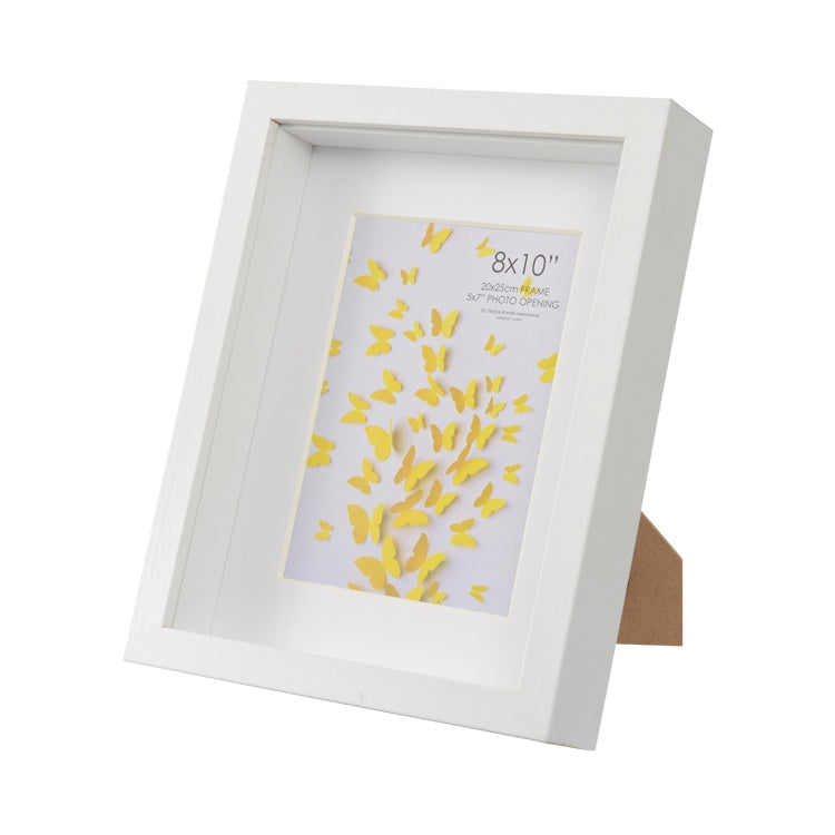 Fits either an 8x10"(20x25cm) photo or a 5x7"(13x18cm) photo in a shadow box frame. Glass front. Stand or hang options.